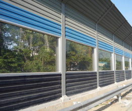 遇到声屏障时,就会发生反射、透射和绕射三种现象。通常屏障能够阻止直达声的传播,并使透射声有足够的衰减,而透射声的影响可以忽略不计。因此,声屏障的隔声效果一般可采用减噪量表示,它反映了声屏障上述两种屏蔽透声的本领。在声源和接收点之间插入一个声屏障,设屏障无限长,声波只能从屏障上方绕射过去,而在其后形成一个声影区,就象光线被物体遮挡形成一个阴影那样。在这个声影区内,人们可以感到噪声明显地减弱了,这就是声屏障的减噪效果。